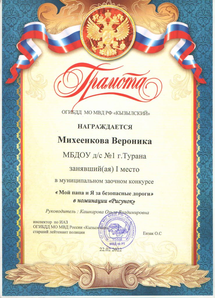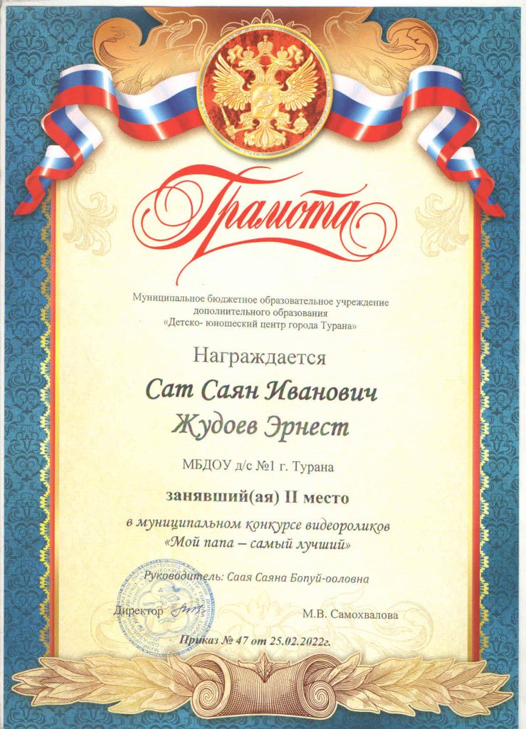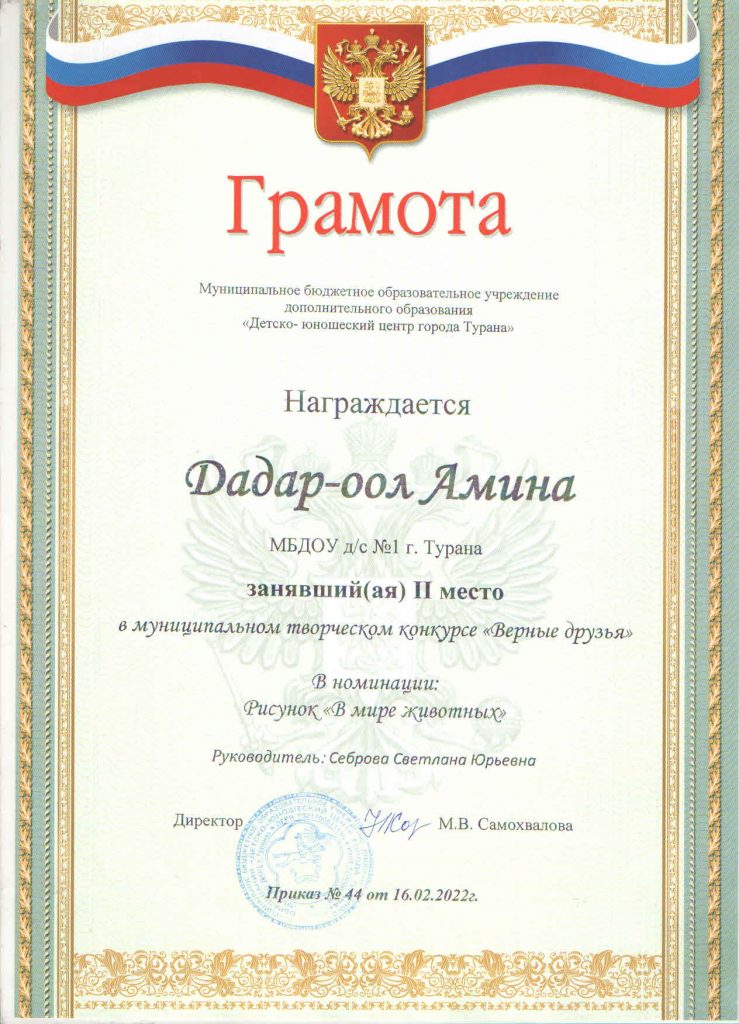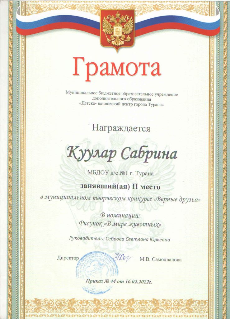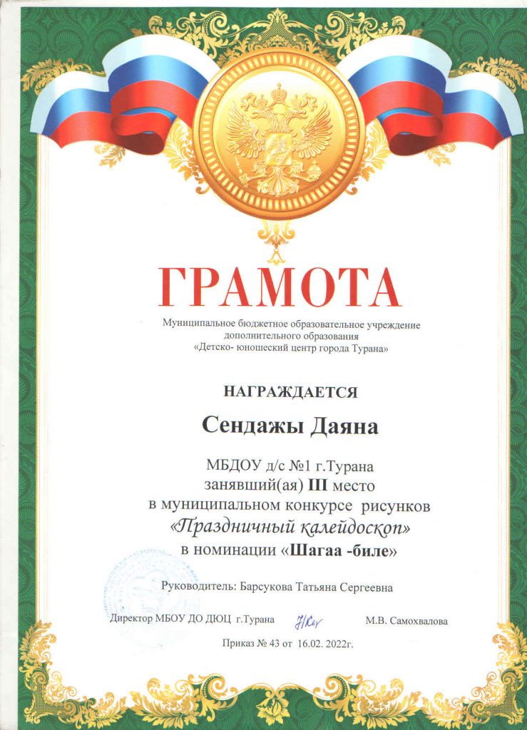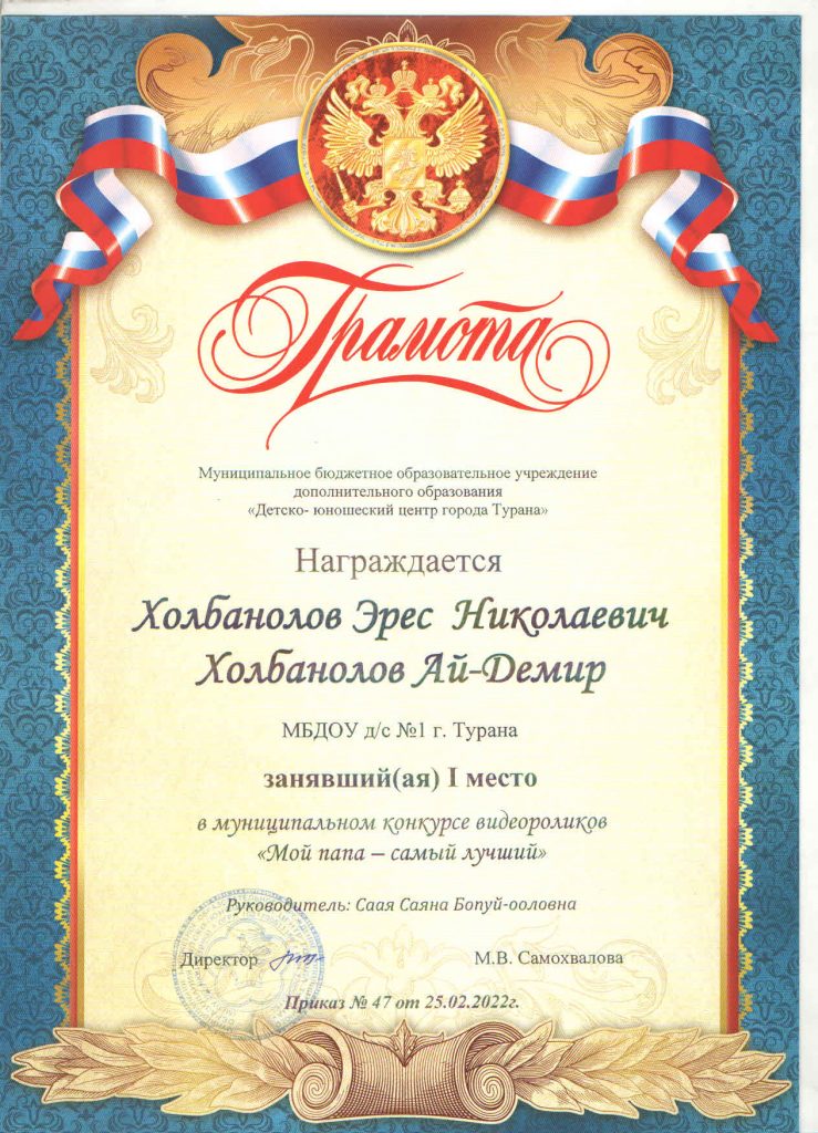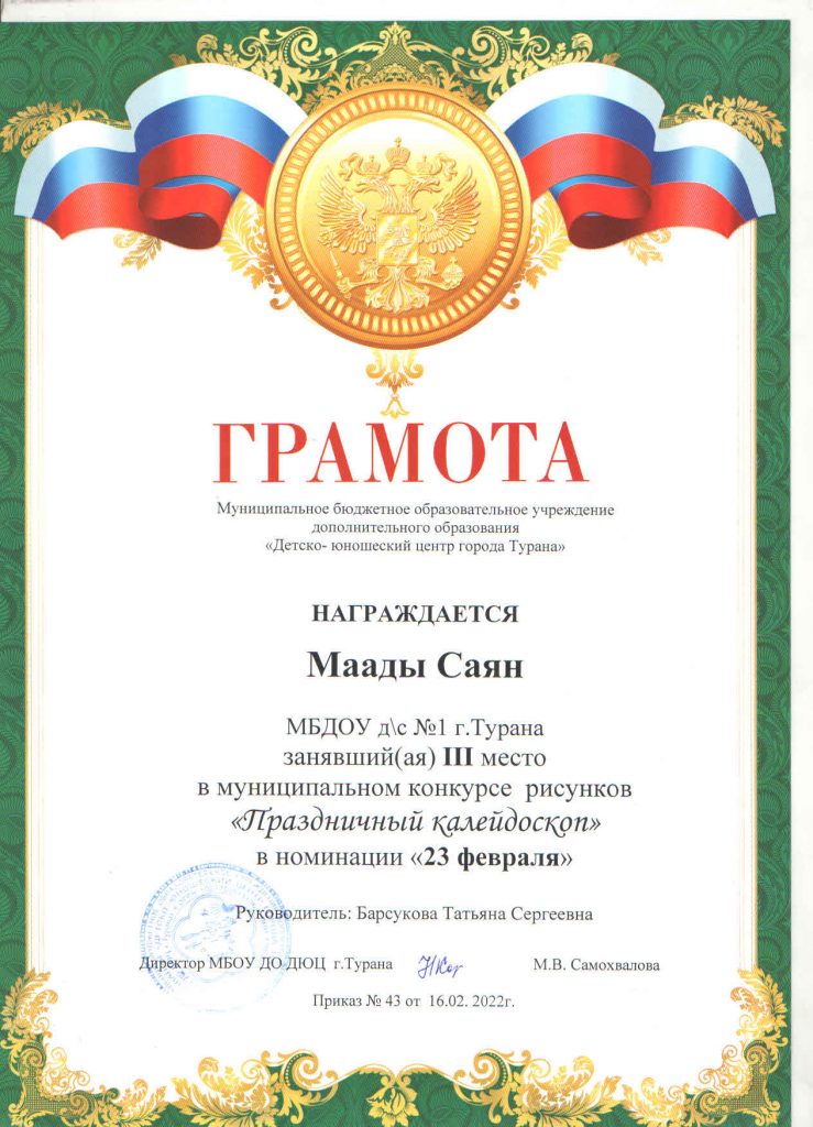 Дети нашего детского сада продолжают активно принимать участие в конкурсах, которые проводит МБОУ Туранский ДЮЦ. Так, в конкурсе «Праздничный калейдоскоп», который проводился в трех номинациях: «Шагаа — биле», «23 февраля» и «8 Марта», приняли участие 9 детей, из них два ребенка заняли призовое 3 место. В конкурсе «Верные друзья» в номинации рисунок «Домашние животные» приняли участие 2 ребенка и заняли 2 место. В муниципальном заочном конкурсе «Мой папа и я за безопасные дороги» приняли участие 3 ребенка, один ребенок занял 1 место. А к 23 февраля был объявлен конкурс видеороликов «Мой папа самый лучший», в котором участвовали 2 ребенка вместе со своими папами и они заняли 1 и 2 места. Хочется поблагодарить родителей и педагогов за активное участие. Молодцы! Так держать!