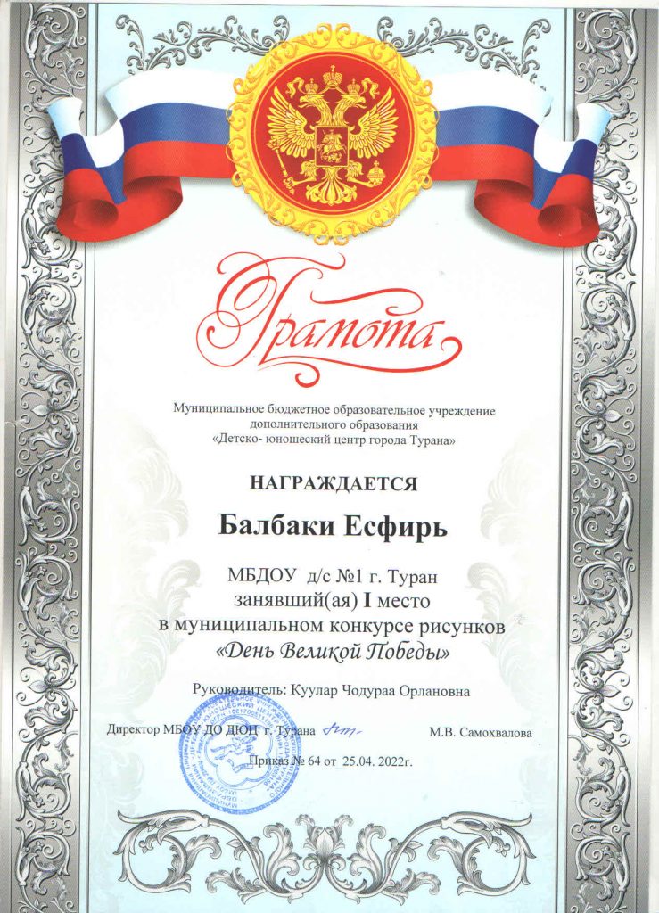 Ко Дню Великой Победы — 9 Мая — 5 воспитанников старшей группы нарисовали рисунки и приняли участие в одноименном конкурсе, который проводил МОУ ДО ДЮЦ г. Турана. По результатам конкурса Балбаки Есфирь заняла первое место, остальные стали участниками конкурса.