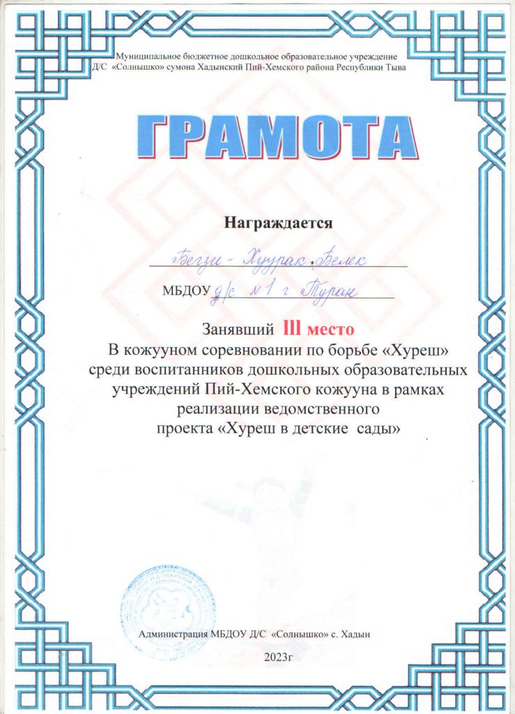 Во исполнение плана основных мероприятий и реализации ведомственного приоритетного проекта Министерства образования и науки Республики Тыва «Хуреш в детские сады», письма Министерства образования Республики Тыва от 17.10.2023г. № 9964, 16 ноября на базе МБДОУ детского сада «Солнышко» с. Хадын состоялись кожуунные соревнования по национальной борьбе «Хуреш» среди воспитанников дошкольных образовательных учреждений. От нашего детского сада в этих соревнованиях приняли участие два воспитанника. Поздравляем Бегзи — Хуурака Байыр — Белека, воспитанника подготовительной к школе группы, который занял третье место.