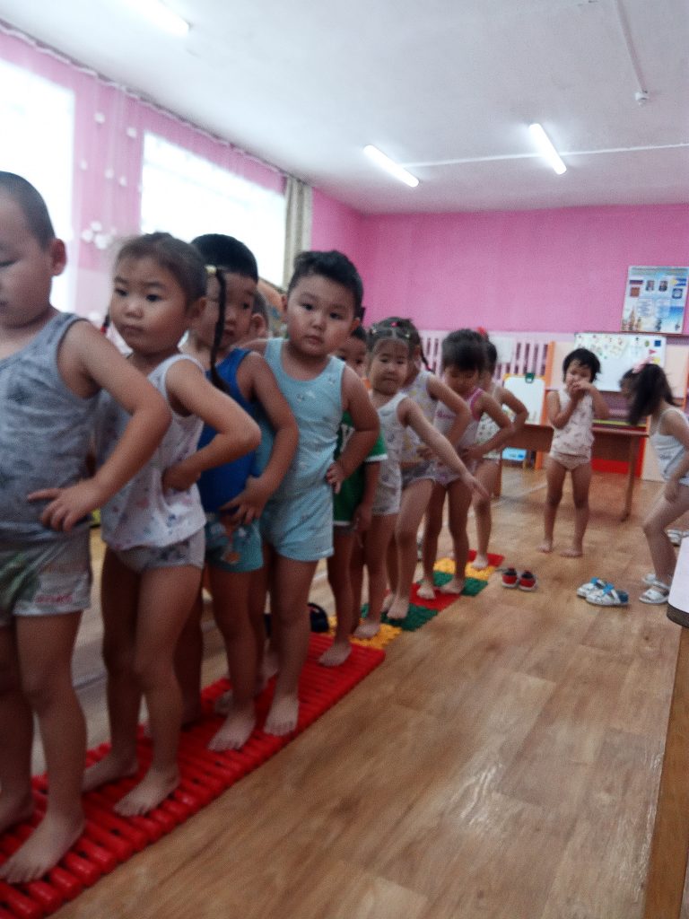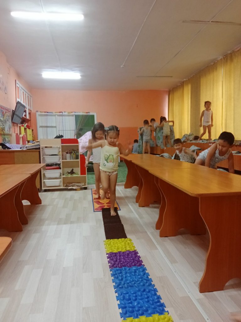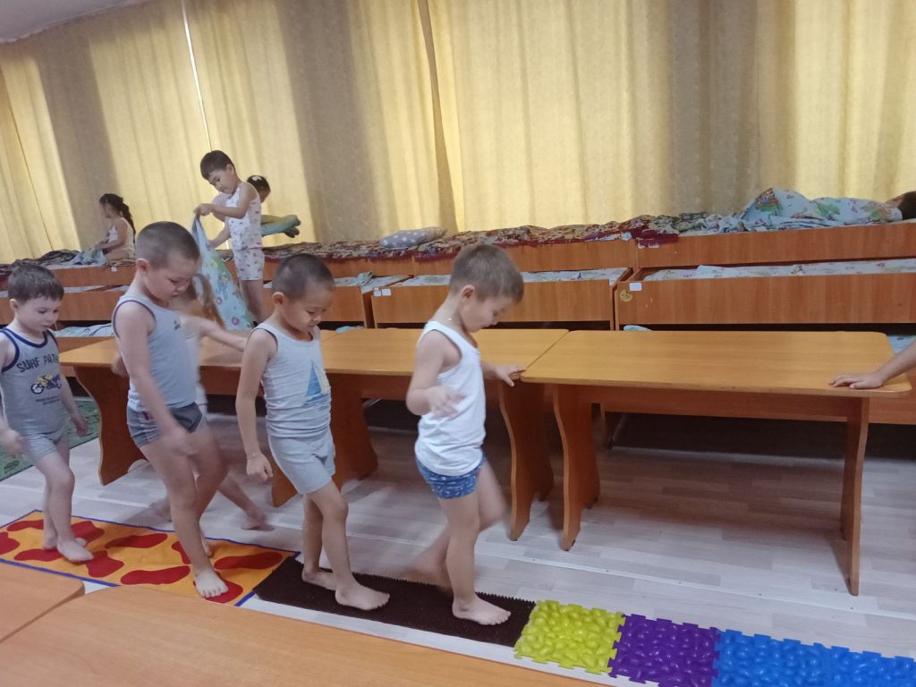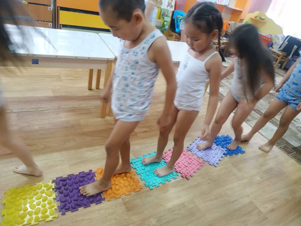 Также большое значение имеет закаливание детей.Одним из методов закаливания является ходьба по коррегирующим дорожкам. Дорожки используются после дневного сна ребенка. С помощью ходьбы по дорожкам развиваются основные функции стоп, дети учатся правильной постановке стоп во время ходьбы, устраняются гипертонусы мышц, улучшается кровообращение стоп, улучшается координация движений. Упражнения с коррегирующими дорожками создают положительный настрой, повышают настроение, дают заряд бодрости и энергии.