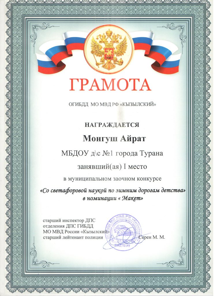 Без рубрики 14.12.2020 / Совсем недавно в нашем кожууне проходил муниципальный конкурс «Со светофоровой наукой по зимним дорогам детства» и воспитанник старшей «А» группы Монгуш Айрат занял первое место. Поздравляем!