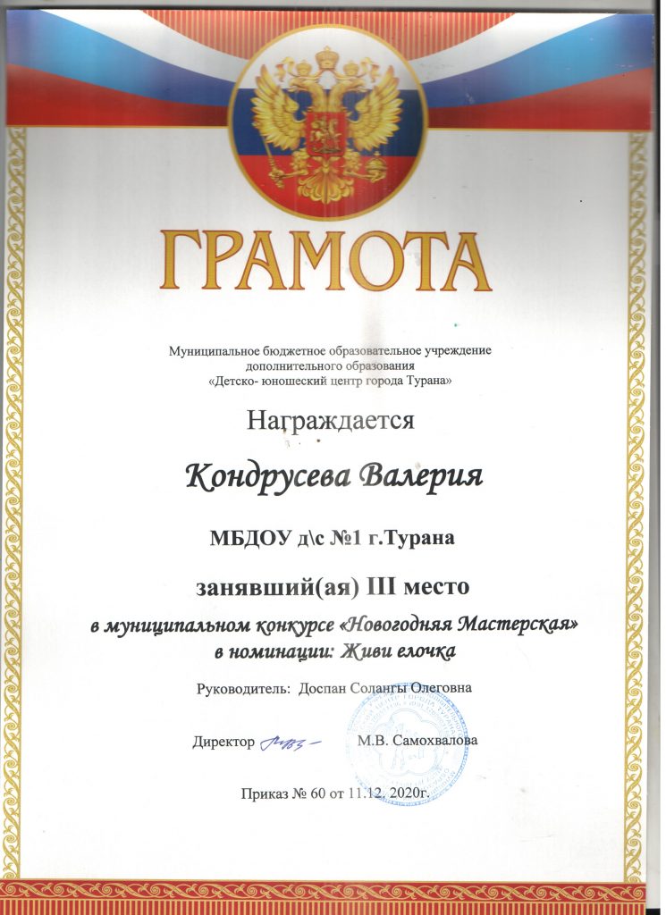 Без рубрики 17.12.2020 / С 1 по 11 декабря 2020 г. в нашем кожууне прошел конкурс «Новогодняя мастерская». Наша воспитанница Кондрусева Валерия заняла 3 место. Всего на конкурс были представлены работы 5 участников. Молодцы!