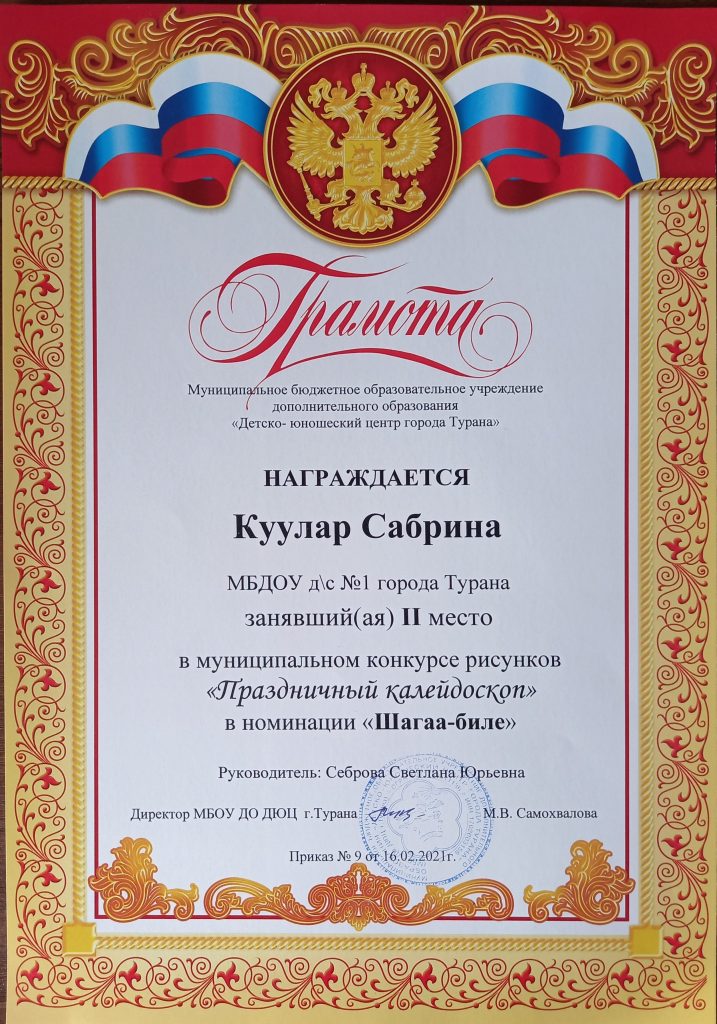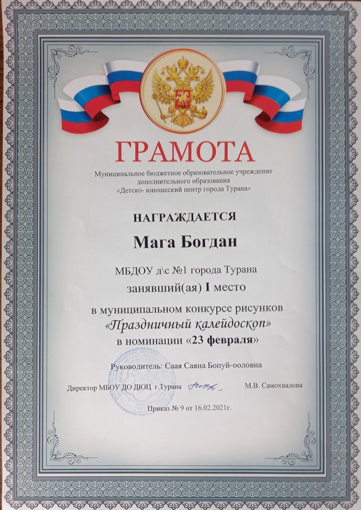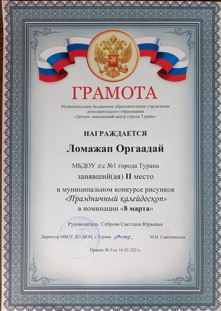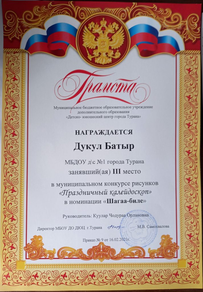С 15 января по 15 февраля 2021 г. в нашем кожууне проходил конкурс детского рисунка «Праздничный калейдоскоп». На этот конкурс можно было представлять рисунки по следующим номинациям: «Шагаа — 2021», «23 февраля», «8 Марта». В этом конкурсе приняли участие 8 наших воспитанников со своими родителями. Трое участников представили свои работы сразу в трех номинациях. Из 8 детей шестеро заняли призовые места и были награждены грамотами. Поздравляем!