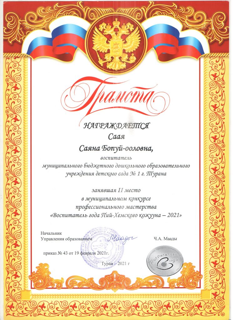 Без рубрики 24.02.2021 / В муниципальном этапе конкурса «Воспитатель года — 2021» наша участница Саая Саяна Бопуй — ооловна заняла второе место. Молодец!